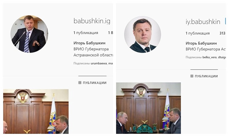 Сегодня, через несколько часов после объявления о назначении Игоря Бабушкина новым врио губернатора Астраханской области в инстаграме было зарегистрировано два аккаунта-близнеца.