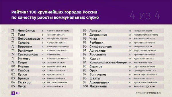 А среди аутсайдеров — Махачкала, Архангельск и Шахты. В среднем по стране участники опроса поставили коммунальным службам пять баллов из десяти.