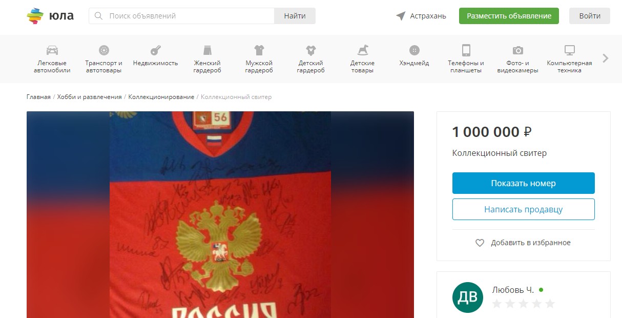 Астраханка сообщает, что на всю Россию всего три таких свитера с автографами всей сборной. Просит Любовь за товар ни много ни мало один миллион рублей.