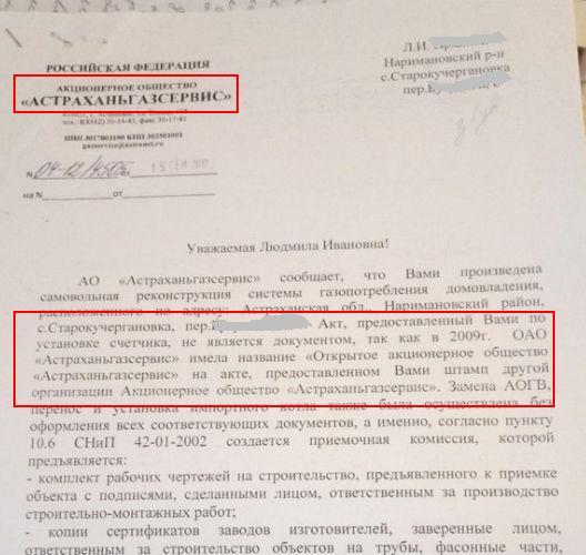 Оказалось, проблема Людмилы Ивановны вовсе не в неправильном штампе на бланке. (Хотя в официальном письме от «Астраханьгазсервиса» написано, что именно в этом). «Письмо они трактуют неправильно», - объяснил нам сотрудник ведомства.