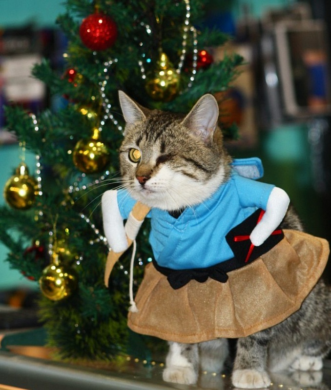 В преддверии праздников четырехлапого помощника продавца нарядили в оригинальный костюм. Теперь животное еще больше поднимает настроение посетителям магазина.