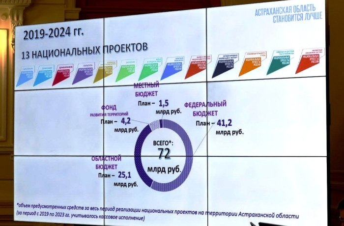 Всего в Астраханской области действуют 13 национальных проектов, на чье осуществление выделено 70 млрд рублей из федерального, регионального и местного бюджетов.