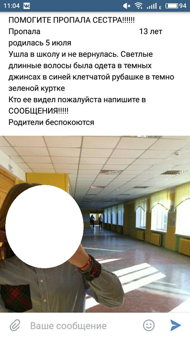 Наш корреспондент отправился в интернет-путешествие, перейдя от предложившей новость (представляющую собой скрин поста) девушки к пользователю, который, собственно, этот пост разместил. Первоисточником выступала якобы сестра пропавшей девочки. У нее в друзьях мы нашли и саму пропавшую (во всяком случае, совпадали имя, фамилия и фото), которая буквально с минуты на минуты была в сети на тот момент. Пост о якобы пропавшей сестре мы нашли еще у одного подростка, находившегося в друзьях у разыскиваемой школьницы. Нам показалось странным: у всех разные фамилии и все - совсем юные астраханцы. Похоже на какой-то юношеский розыгрыш.