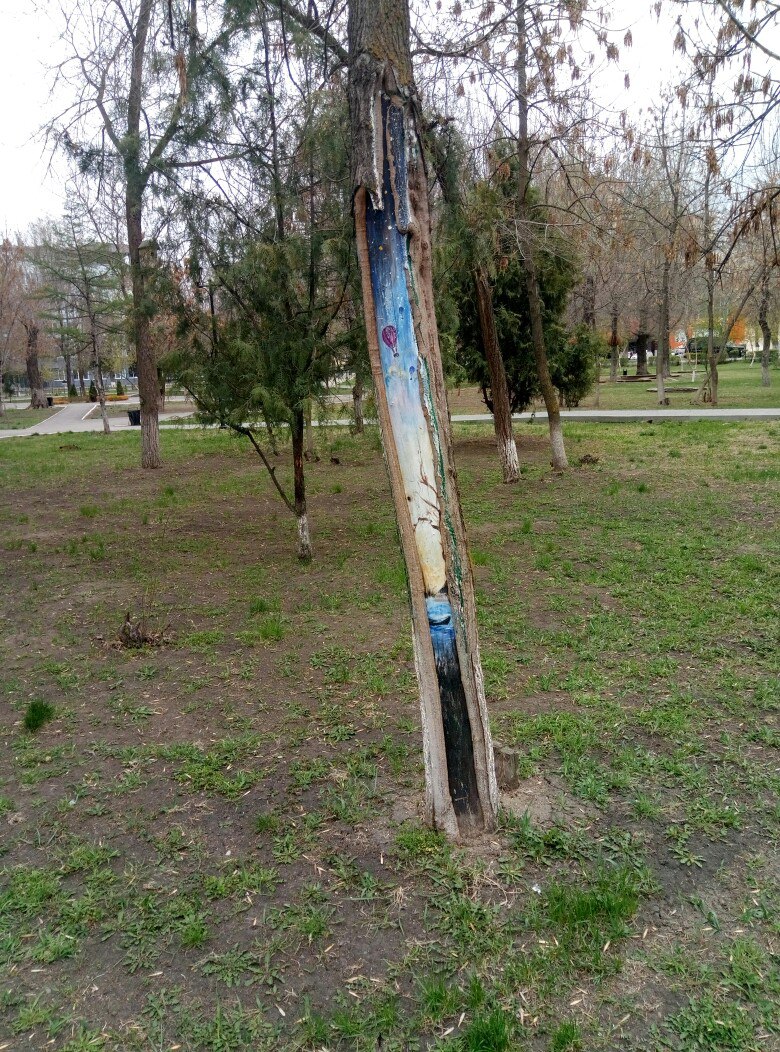 Первым обнаруженным арт-объектом стало дерево, у которого отошла часть коры. Неизвестный художник расписал появившуюся трещину, создав настоящее окошко в другое измерение.