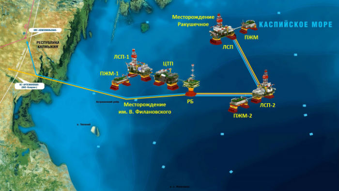 Непосредственная близость с действующими месторождениями Компании на Каспии позволила существенно оптимизировать проект обустройства за счет использования существующей инфраструктуры для подготовки и транспорта продукции, а также обеспечения энергоснабжения Ракушечного месторождения. Продукция Ракушечного месторождения будет направляться на подготовку на центральную технологическую платформу месторождения им. В. Филановского и далее через КТК на экспорт.
