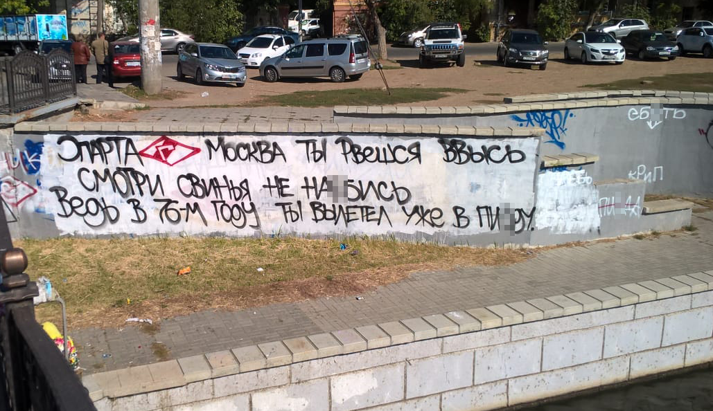 Нетрудно заметить, что анти-спартаковское граффити выгодным контрастом выделяется на белой загрунтованной поверхности парапета. Это городские коммунальщики «подготовили» холст, закрашивая предыдущее творчество. Если память не изменяет, там была пара хулиганских стишков из Есенина – тех, что про «баб на свежем сене» и его же знаменитое «не тужи, дорогой, и не ахай».