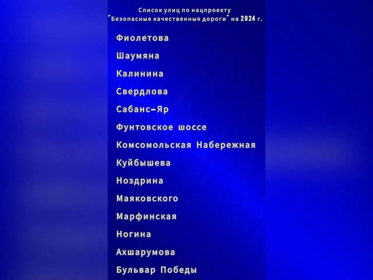 В администрации города утвердили список объектов, где в следующем году отремонтируют дороги. Самым крупным проектом станет улица Свердлова. Подрядчику предстоит восстановить почти 2,5 километра покрытия. Самым отдалёнными стали улицы Сабанс-Яр и Фунтовское шоссе.