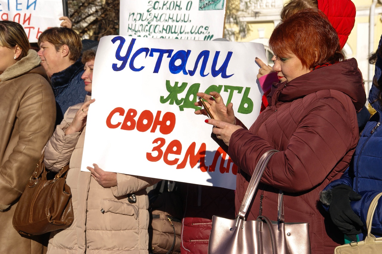 - Многим из нас (и мне в том числе) в декабре прошлого года вручили сертификаты на землю. Однако до сих пор участки мы так и не получили. У власти проблемы то с межеванием, то с проведением коммуникаций. По факту всё это оказалось фальшью. Когда мы приехали в Мошкариху, которую все хвалят и где обещают организовать 300 участков, мы были в шоке: весной там всё затопило по самый асфальт, и засыпать все эти неровности, высушить грунт выходит в очень большие деньги. Я получила сертификат в декабре прошлого года. За год не изменилось ничего. И это при условии, что я была 32-ая в очереди. Многие из вас - в первой и даже во второй тысяче. Когда нам выдадут землю, непонятно. Поэтому нам надо настойчиво заявлять о своём законном праве, - говорила с импровизированной трибуны мама Римма.