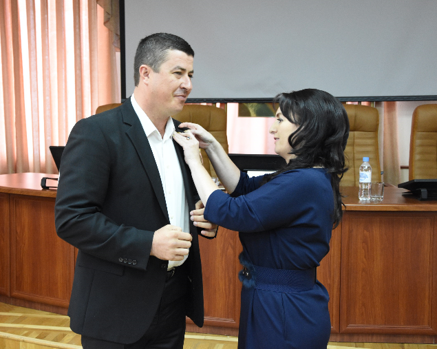 Алена Вячеславовна лично вручила новичкам по папке, а также прикрепила им на лацканы депутатские значки.