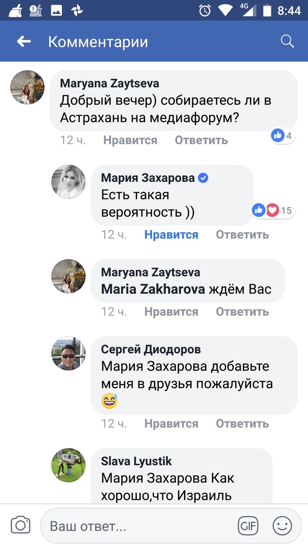 Один из организаторов мероприятия Марьяна Зайцева спросила у официального представителя Министерства иностранных дел Российской Федерации Марии Захаровой на ее странице в Фейсбуке, не собирается ли она посетить астраханский медиафорум.