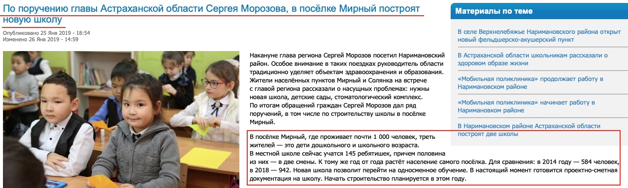 Так, первым пунктом в образовательной части доклада Казбека Хадикова стали две идентичные школы в пос. Мирный в селе Каралат. Эти две образовательные организации идут дуплетом, потому как они были яркими пятнами избирательной кампании Сергея Морозова. То есть, по сути, остались в наследство новому правительству только лишь потому, что об этих объектах Морозовым было объявлено публично на сходах граждан.Именно Сергей Морозов, побывав в посёлке Мирный Наримановского района, проникся бедой местных жителей и пообещал им новую школу взамен деревянного барака с классами на 10 человек. Дело это было ровно год назад - в конце января 2019-го. Тогда же пресс-служба врио губернатора отрапортовала: ПСД на школу уже якобы начали готовить (вероятно, ясновидящие предсказали, что Морозов даст такое поручение), её строительство начнётся уже в этом году.