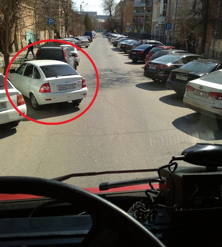 Из-за торчащей филейной части легковушки габаритная пожарная машина не могла протиснуться вдоль проезжей части.