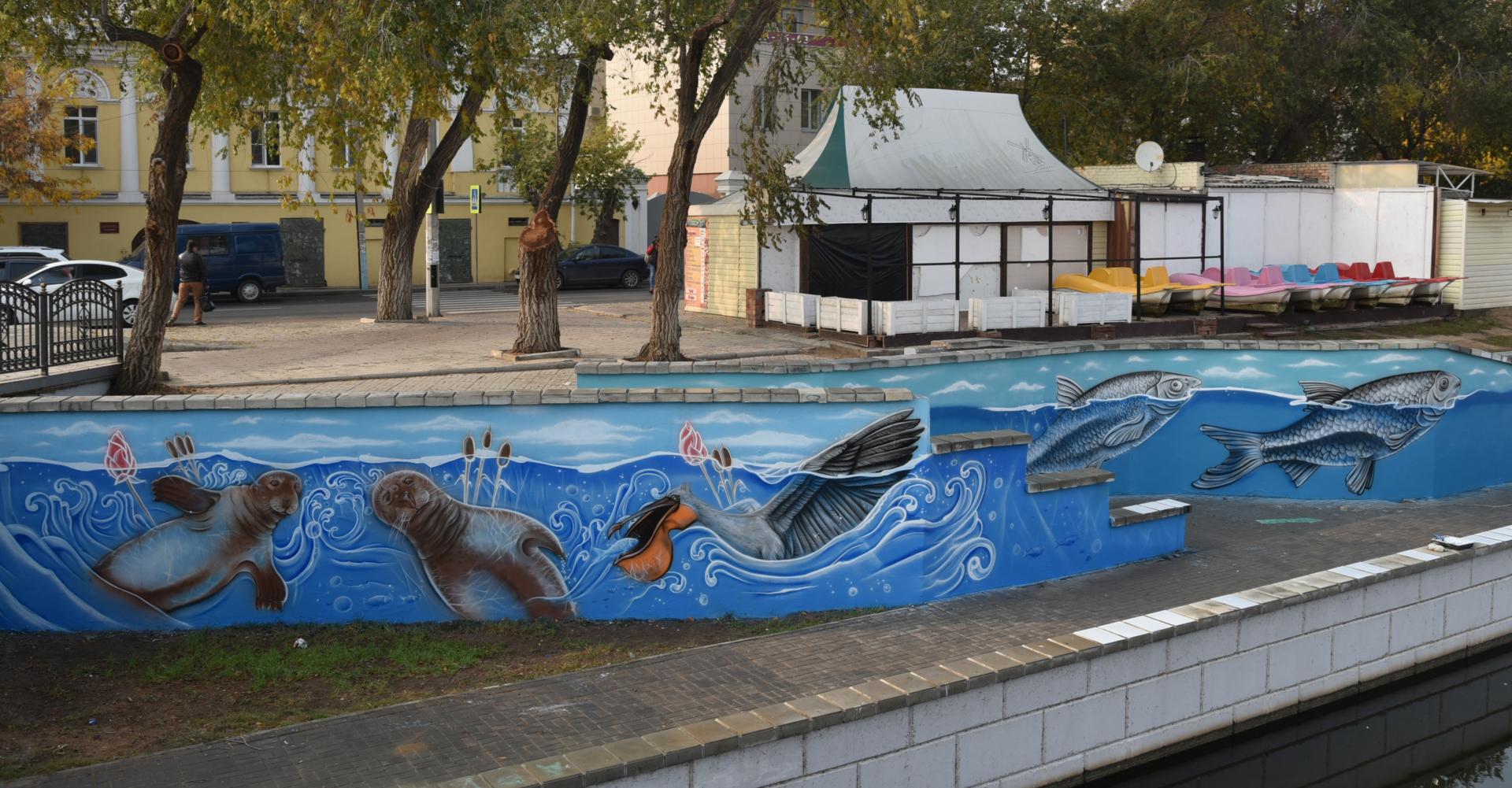 Но самая значимая и при этом уникальная часть благоустройства - роспись бетонного ограждения в створе моста влюбленных. На стене изобразили обитателей Каспийского моря: воблу, тюленей пеликана. Чуть позже там же появятся черепаха и раки.