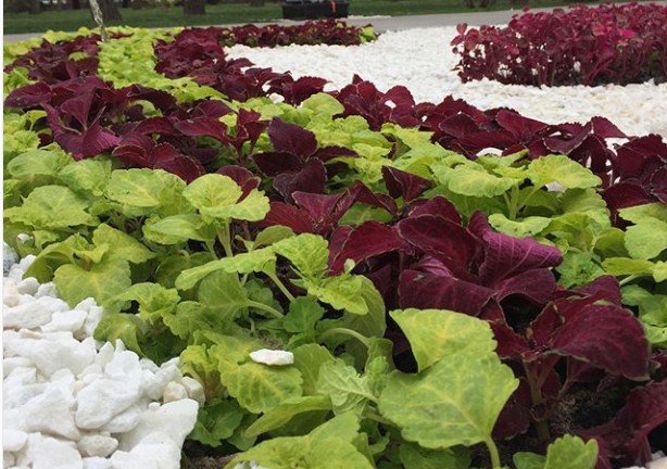 Клумбу, украшенную тремя звездами из однолетних цветов колеуса, тагетиса и ирезине, обрамляет подсыпка из белого мрамора.
