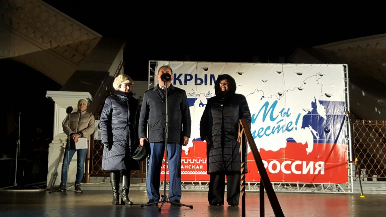 В воскресенье поздно вечером в Кремле состоялся митинг-концерт, посвящённый четырёхлетию присоединения Крыма к России. Патриотическая вечеринка собрала на площади возле Успенского собора порядка полутора - двух тысяч человек (по нашим скромным прикидкам). По официальной версии, собравшихся было гораздо больше - около четырёх тысяч. Они размахивали триколорами, танцевали под патриотичные песни и активно встречали всех, кто выходил на сцену.