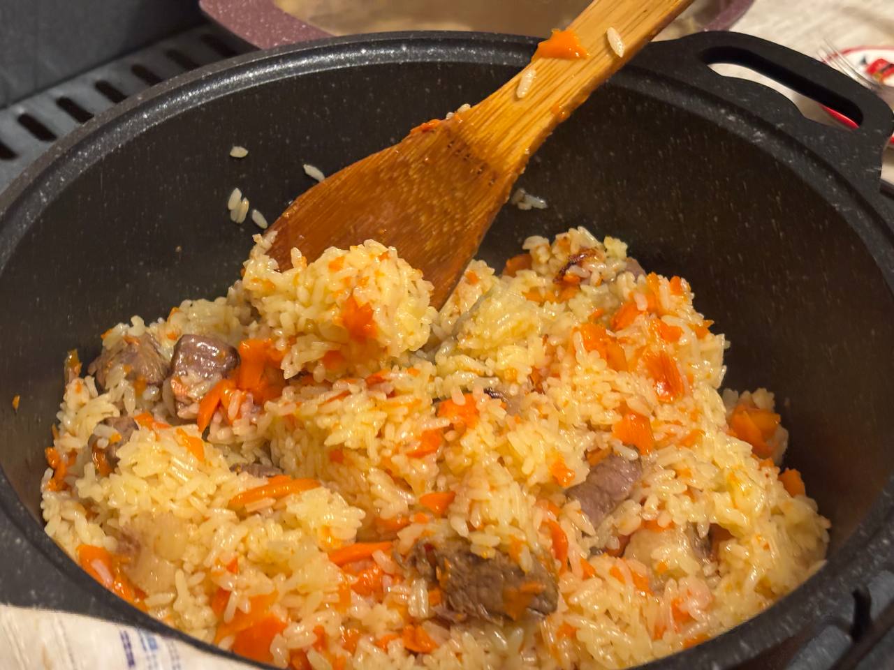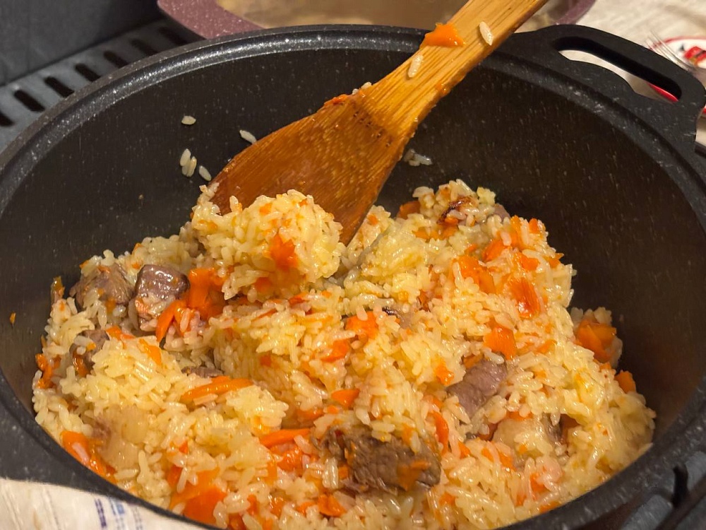 Входит промытый рис, и начинается волшебство. Вода заливается не просто так, а осторожно – через шумовку. Узбекский плов не мешают – в этом вся философия. До закипания – полная тишина. Потом – дырочки в рисе, снижение огня… и терпение. Один из секретов в приготовлении – это железная подставка под казан, которая не дает плову подгореть.