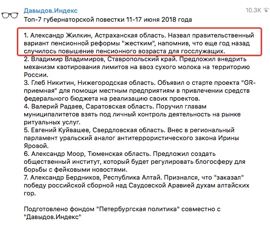 Упомянутый нами «Давыдов.Индекс» опубликовал топовые высказывания российских политиков за и против повышения пенсионного возраста. Думаем, нашим читателям также будет интересно поковыряться в словесах уважаемых людей.Топ-7 заявлений сторонников пенсионной реформы