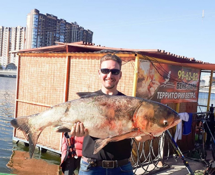 Астраханец Александр Дарьянов поделился в соцсетях фото своего улова. 16-килограммового толстолобика он выловил прямо в центре города, в районе храма Святого Владимира.