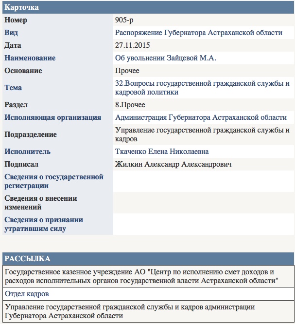 Оказывается, Марина Зайцева и вправду была уволена с должности в 2015 году распоряжением главы региона №905-р. Вот скрин: