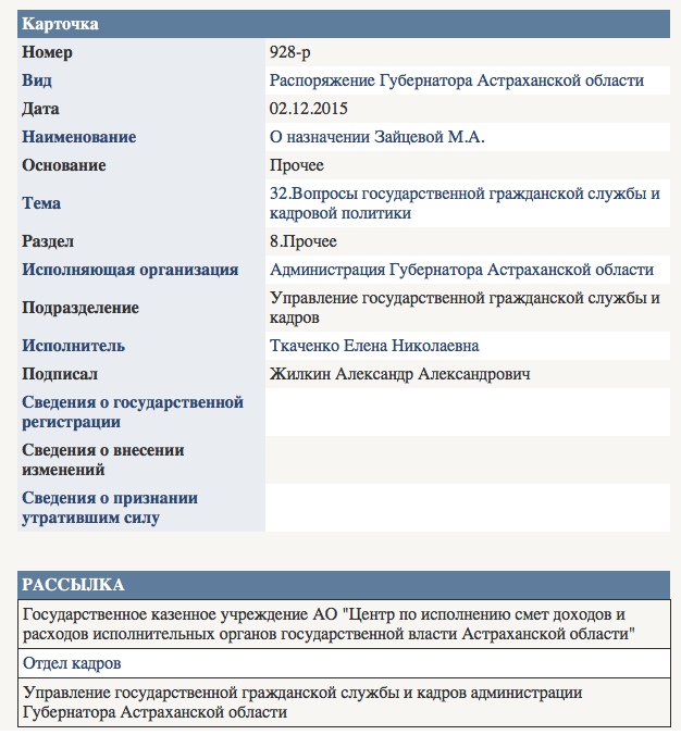 «ПУНКТ-А» решил проверить эту информацию самым простым и доступным способом: мы залезли на сайт документов администрации губернатора Астраханской области. Дело в том, что работодателем всех руководителей органов исполнительной власти региона (и агентства связи в том числе) является губернатор. Именно его распоряжением назначают на должности и увольняют министров и руководителей ведомств. Что же мы нарыли в картотеке документов?