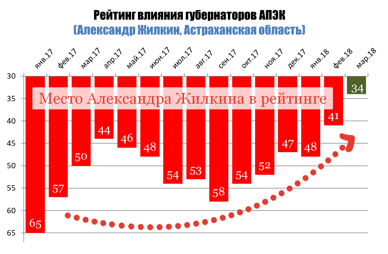 Составители рейтинга прокомментировали такой взлёт: «Укрепляет влияние губернатор Астраханской области Александр Жилкин (с 41-го на 34-е место) – после того, как его регион в числе первых защитил в Минприроды РФ проекты, финансируемые до 2025 года в рамках федеральной программы по оздоровлению Волги. На них предполагается выделить 98 млрд рублей».