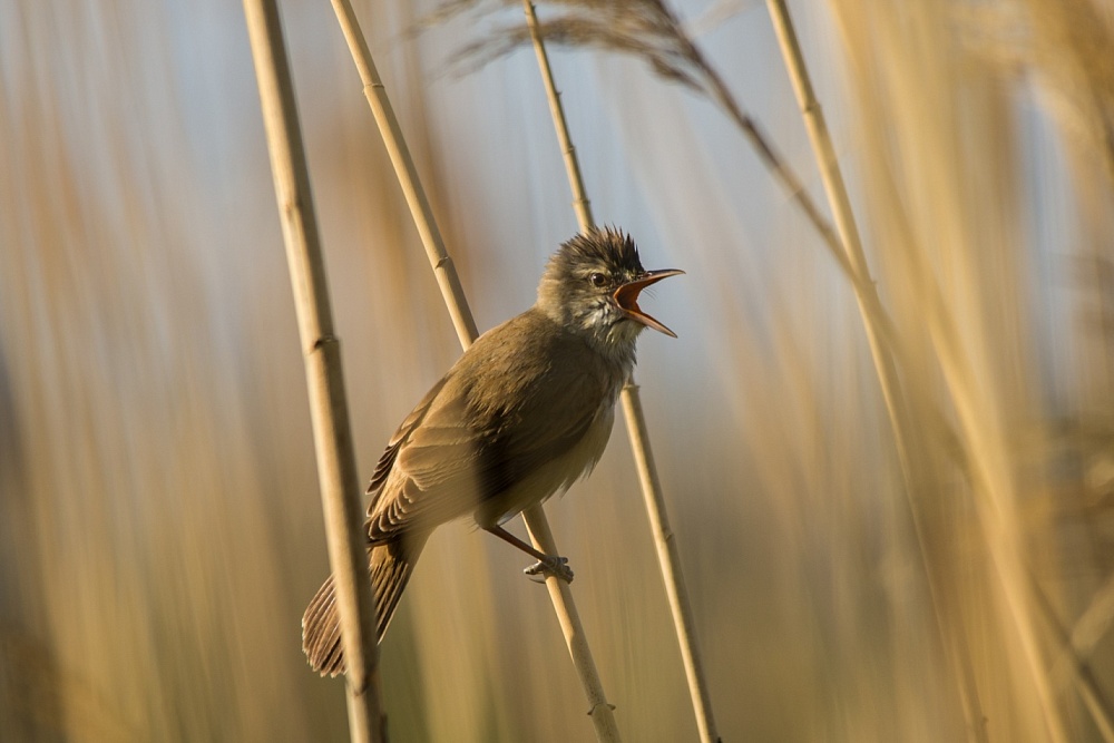 И начнем мы, пожалуй, с самой крупной и громкой из всех камышовок – дроздовидной. Кстати, сразу скажем, что используется два варианта названия, камышевки и камышовки. Так вот, весной и в начале лета самцы дроздовидной камышовки часто забираются на вершины стеблей тростника и оглашают окрестности своими довольно неприятными и резкими криками, напоминающими скрип железа по стеклу. Таким образом они обозначают границы своих гнездовых участков.