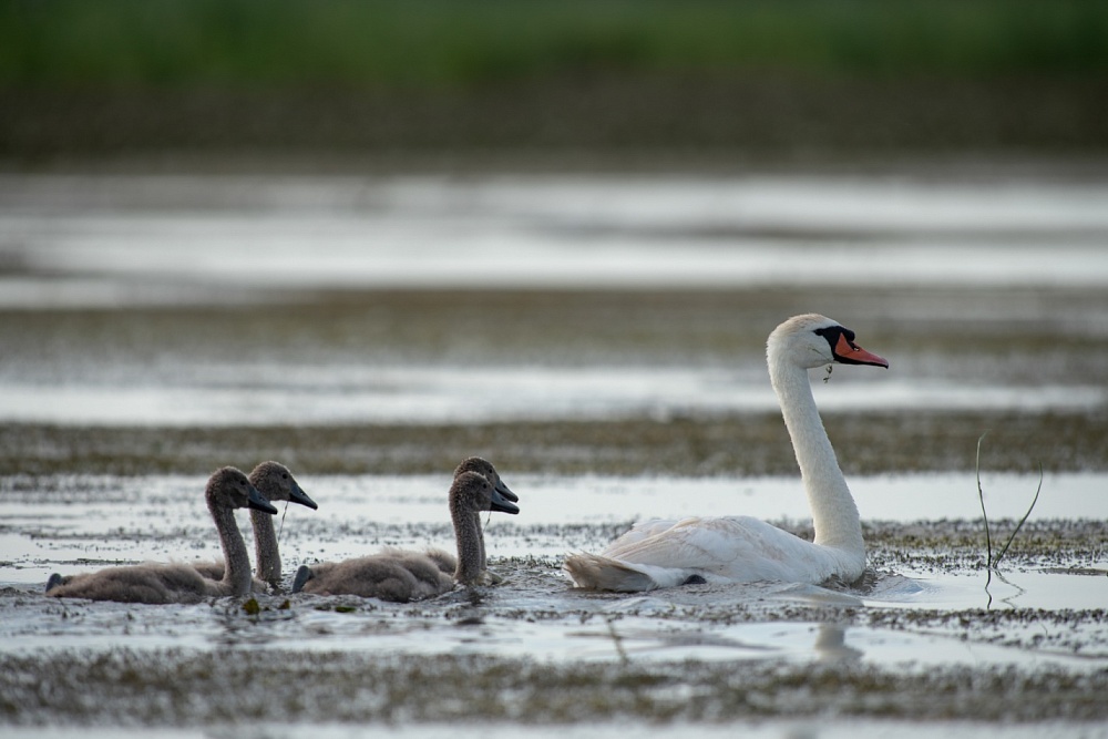 Лебеди-шипуны зимуют в низовьях, где часто остаются свободные ото льда участки воды, а также на ильменях. Эти мелководные озера редко замерзают полностью, часто в центре остаются проталины, около которых всю зиму держатся водоплавающие. Так что период гнездования у них начинается относительно рано, и к июлю их подросшие птенцы, те самые «гадкие утята» из сказки Андерсена, повсюду следуют за родителями. Они уже самостоятельно питаются водорослями и мелкими членистоногими, но, конечно, нуждаются в родительской опеке и защите.
