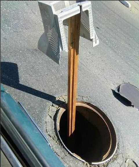 Видимо, чтобы предупредить об этом водителей, кто-то установил самодельный знак, водрузив на деревянную палку пластиковую конструкцию.