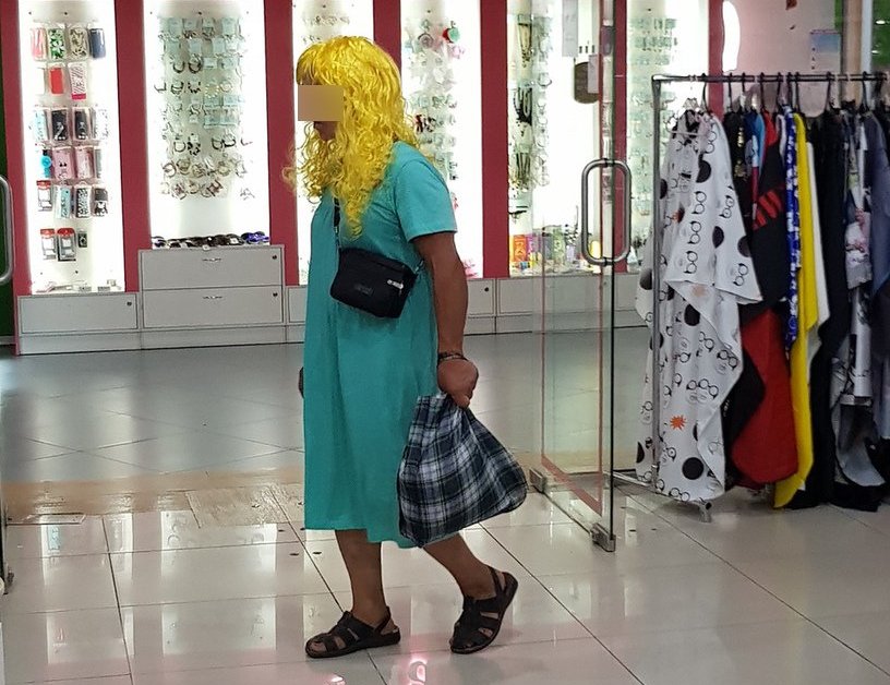 В одном из магазинов Трусовского района заметили необычного посетителя. Или посетительницу. Непонятно. Это, собственно, и стало причиной интереса. Потому что очень странный блондинистый парик и платье в сочетании с мужской фигурой, сумкой и сандалиями не дает точно понять, какого же пола объект на фото.