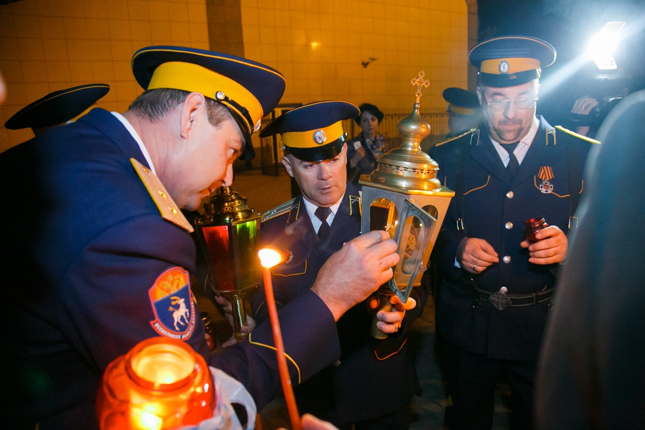 Около 5 часов в этом году ждали схождение святого огня в Храме гроба Господня. В аэропорту Астрахани его встречали десятки верующих из разных районов области. Они зажигали лампады, лампы и церковные фонари. Один из светильников атаман Константин Маркелов доставил в Покровский собор. Здесь он передал огонь архиепископу Ионе и губернатору Александру Жилкину, сам же отправился на пасхальную службу в Успенский собор кремля.