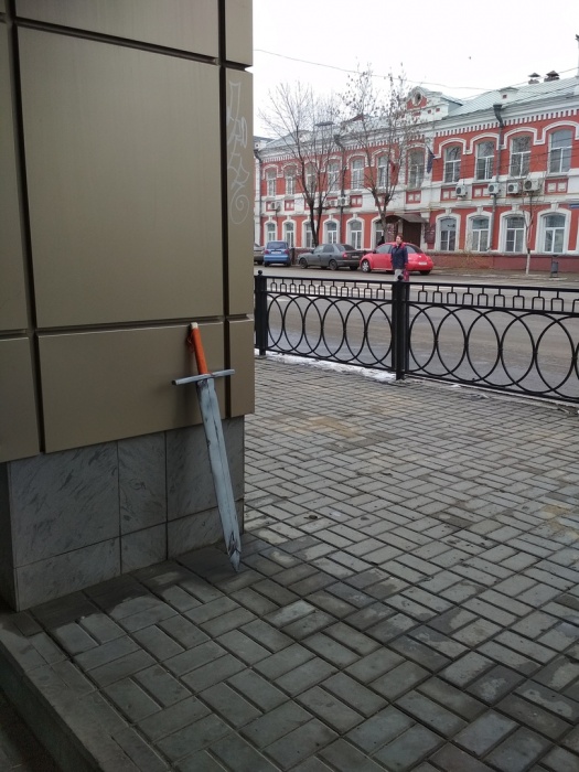 Типичная Астрахань". Меч был оставлен на улице и в гордом одиночестве ждал своего владельца. Не знаем, нашелся ли какой-нибудь Артур, но, кажется, просто так холодное оружие не забрать. Кстати, да, надеемся, что речь идет о безобидной игрушке.