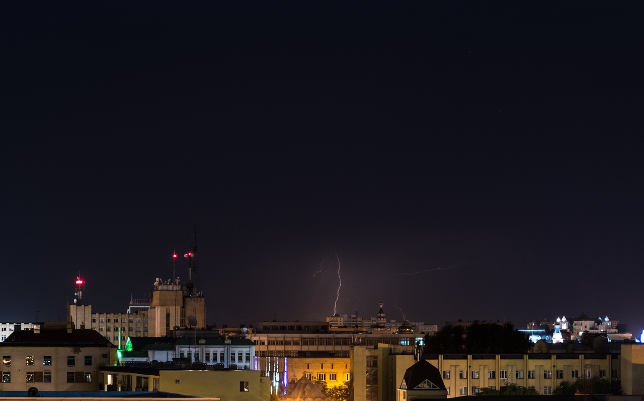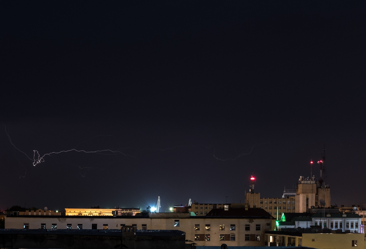 Озаряемая вспышками далеких молний, мощная грозовая облачность наблюдалась в северной части неба. Но несмотря на все предвестники близкого ненастья, гроза обошла город, на землю не пролилось ни капли влаги. Грозу синоптики обещают сегодня. Посмотрим, насколько верны их прогнозы.