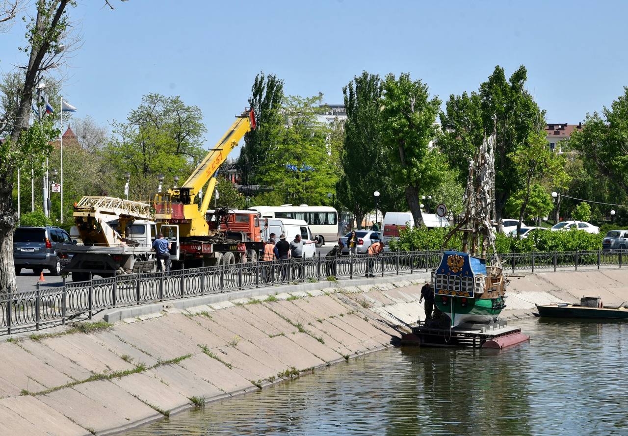Сегодня сотрудники муниципального учреждения «Зелёный город» вновь установили копию военного фрегата «Орёл» на акватории Приволжского Затона, об этом сообщает пресс-служба администрации МО "Город Астрахань". .