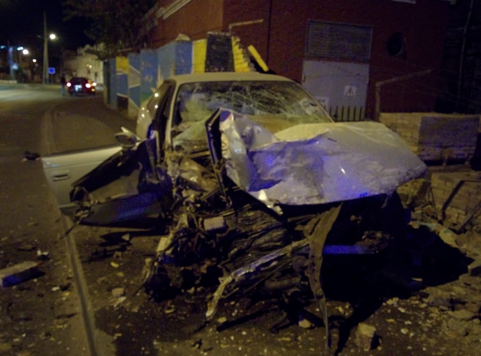 Ночью в центре Астрахани Тойота снесла кирпичную стену, есть пострадавшие