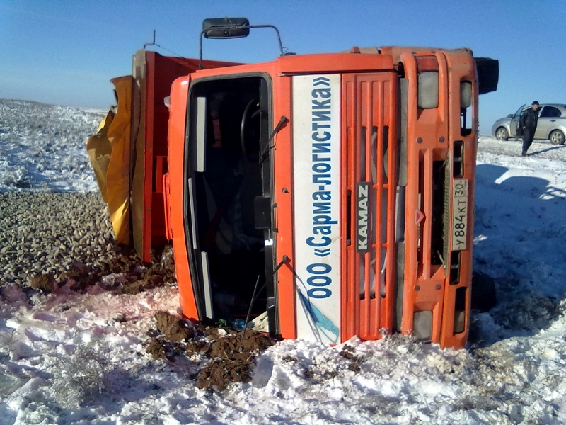 Вчера, 4 декабря, в Лиманском районе около села Зензели «КАМАЗ», перевозивший строительный щебень, съехал с основной дороги и перевернулся.