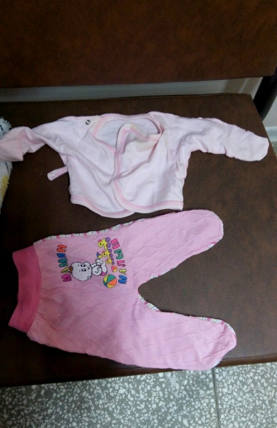 Девочка была одета в розовую сорочку, ползунки того же цвета и завернута в махровый светло-голубой халат 44-46 размера с белыми цветами.