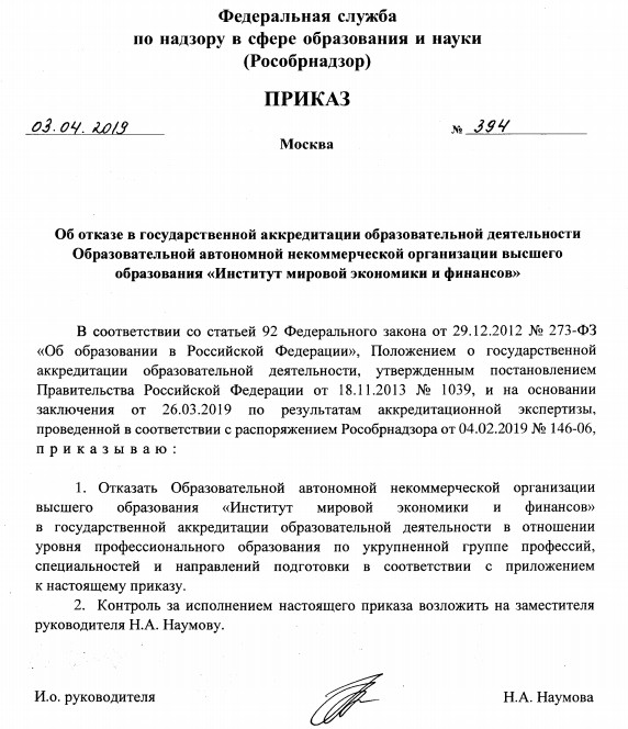Согласно опубликованному приказу, астраханскому Институту мировой экономики и финансов в государственной аккредитации было отказано. А точнее, аккредитацию ВУЗ не получил по направлению "Информатика и вычислительная техника".