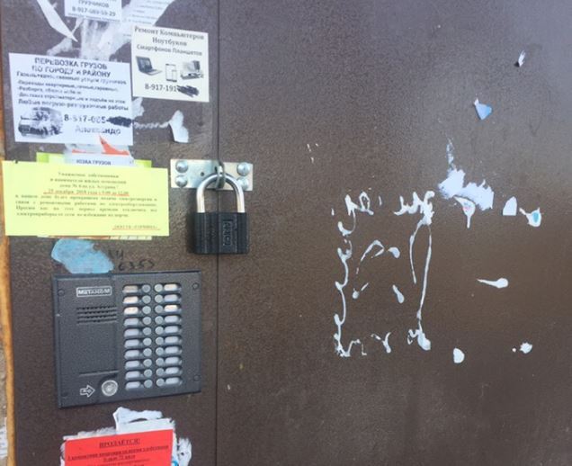 К счастью, свет на ситуацию пролила одна из местных жительниц. Выяснилось, дверь ведет не в подъезд, а в подсобное помещение. Разумеется, все те, кто впервые здесь оказываются, пытаются позвонить в домофон (хотя кнопки отключены) и понять, как работает замок. Но людей внутри нет.