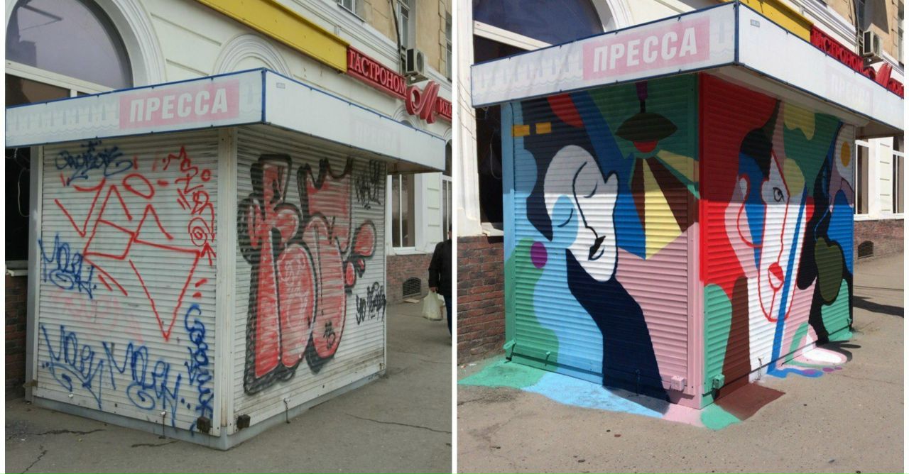 Под руководством художника-аэрографиста Владислава Мамонтова студенты аэрозольными красками за четыре часа превратили киоск, фасадная часть которого была испорчена множеством надписей и тэгов, в настоящий арт-объект.