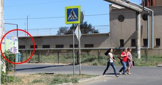 Там на пересечение улиц Вагнера и Кутумная установлены дорожные знаки «Пешеходный переход», но на одном из участков посреди тротуара стоит информационный щит, угрожающий безопасности пешеходов, которым приходится обходить его, выходя прямо на проезжую часть.