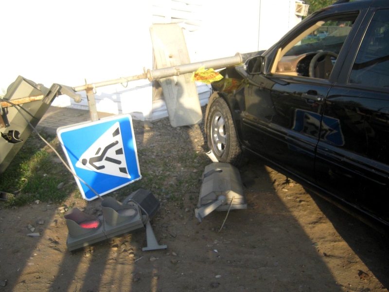 Также была сбита стойка с дорожным знаком и светофором. Впоследствии машина врезалась в торговый павильон.