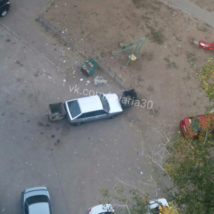 В одном из дворов астраханских многоэтажек водитель девятки неправильно припарковался у мусорных контейнеров, затруднив мусоровозу выполнение прямых обязанностей.