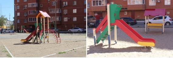 Как выяснилось, застройщик благоустроил территорию жилого комплекса в соответствии с утверждённым проектом: устройство проездов, пешеходных дорожек и гостевых стоянок, установка детской площадки с игровыми элементами и уличными тренажёрами, скамеек и урн. Но качели-балансиры и тренажёры просто поломали хулиганы.