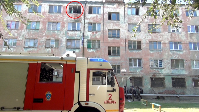 Из окна на пятом этаже виднелся дым, оттуда на землю летели горящие вещи.