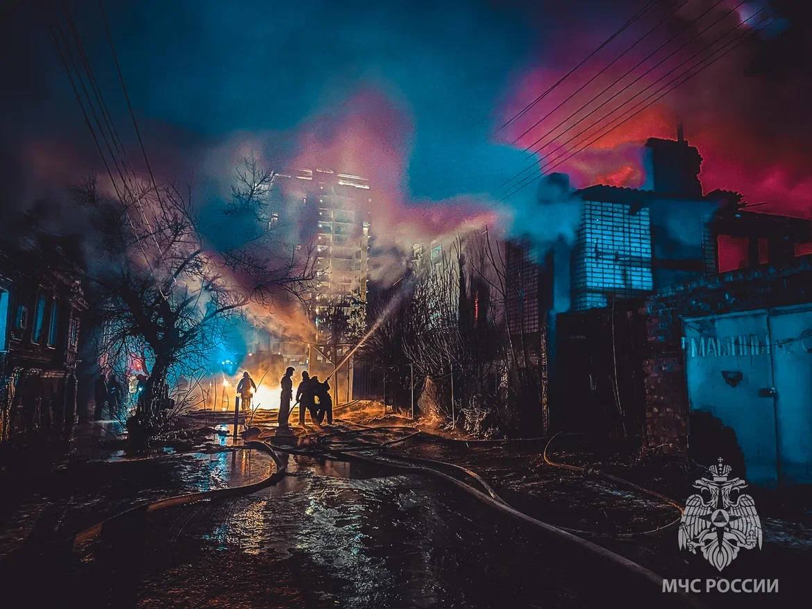 Напомним, сегодня в полночь крупный пожар охватил трёхэтажное неэксплуатируемое строение и двухэтажный жилой дом по улице Донбасской, 15 в Кировском районе (возле ЖК «Волжская Ривьера»). Общая площадь поражения составила 150 кв. метров.