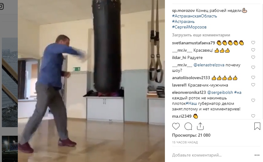 "Конец рабочей недели", - подписал он короткий ролик. Вероятно, врио губернатора Астраханской области находит в своем плотном графике время для регулярных тренировок. А может быть - именно в эту пятницу его уж очень сильно разозлили подчиненные, так что пришлось "сбрасывать пар", нанося удары груше. А может быть - и то и другое сразу. Еще одна популярная версия, обсуждаемая в соцсетях, - Сергей Морозов намекает потенциальным инвесторам, что с ними будет, если они не будут вкладывать деньги в развитие Астраханской области. Шутки шутками, но мы искренне восхищаемся людьми, которые в пятницу вечером после трудной рабочей недели находят силы заниматься спортом. Так держать!