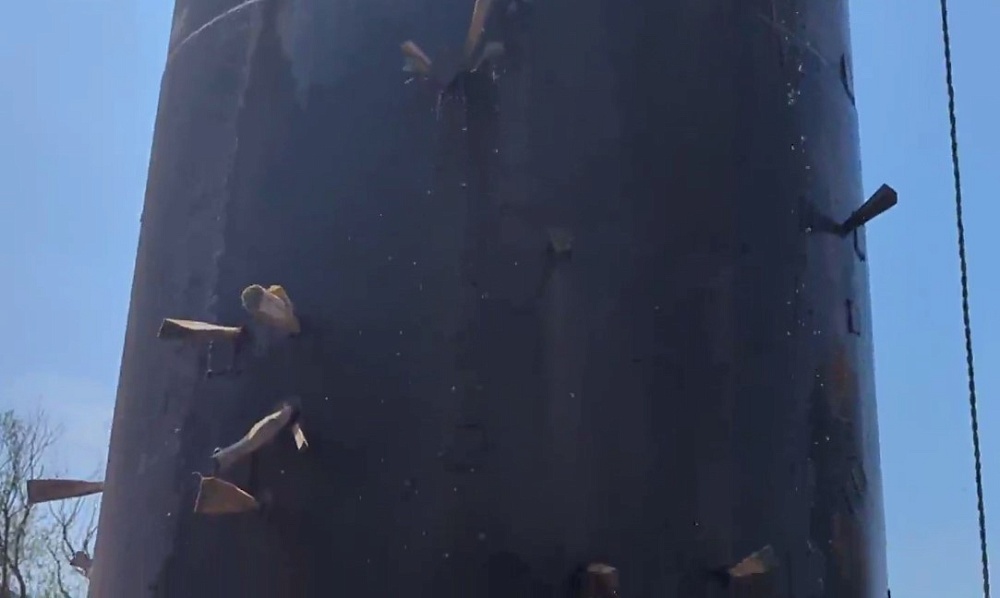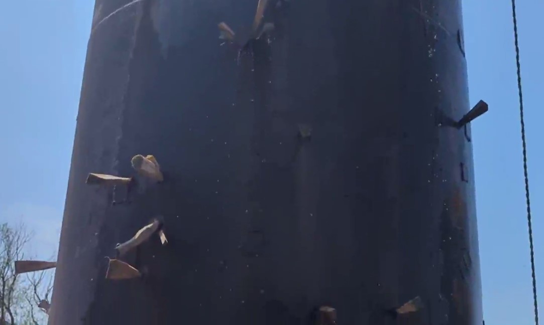 Водонапорная башня в селе превратилась буквально в решето. Струи воды из нее брызжут во все стороны. Жители сами забивают в дырки чопики, но рядом тут же образуются новые пробоины. Башня уже напоминает ежа. Конструкции больше 45 лет, досталась она от бывшего колхоза.