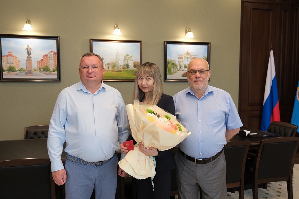 Председатель Думы Астраханской области Игорь Мартынов вручил удостоверение Надие Ажгельдиевой.